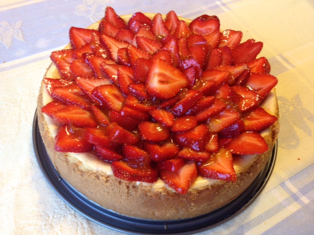 Release cake from springform pan and arrange strawberry slices like rose petals in circles to cover the top of cake completely. Melt preserves and brandy in a small saucepan until boiling and brush the glaze abundantly over the strawberries, allowing the glaze to trickle down between them and onto the cake top. Chill again until serving.