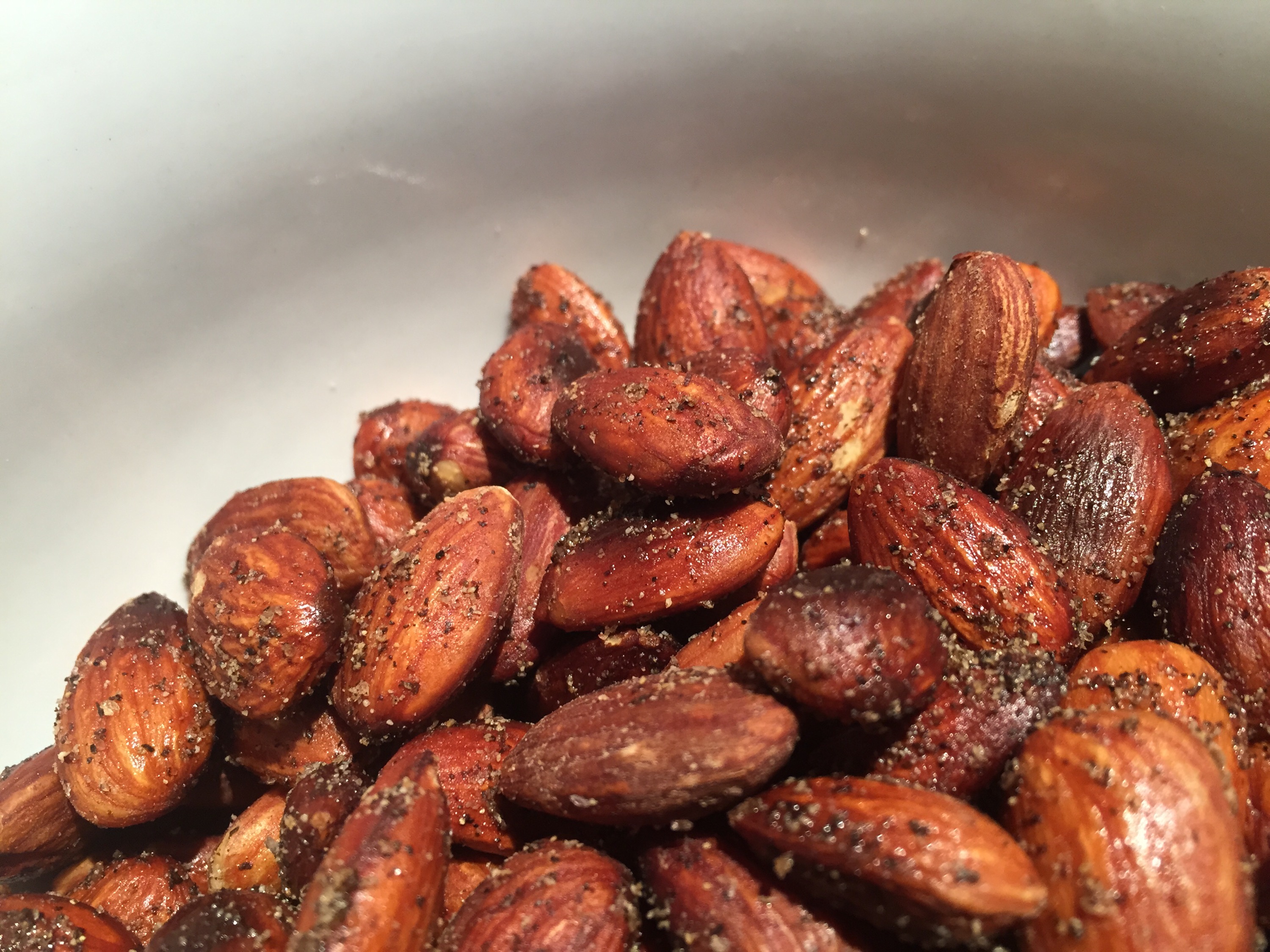 Toss all ingredients together in a large bowl until the almonds are well coated. Roast in a single layer on a cookie sheet at 350° for 10 to 12 minutes, shaking the pan once during roasting.