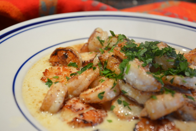 Today is my husband’s birthday, so he got to plan his own birthday dinner. He chose staying home and he chose the menu. Having lived for decades on the Outer Banks, he loves seafood. I am from California, so I also love seafood. This is a super simple recipe that gets a sophisticated flare from white wine, a richness from cream, and an out-and-out decadence from pan seared scallops. This would go well over angel hair pasta or even rice. The sauce would be delicious with a crusty bread and a high quality butter. You really can’t go wrong here.